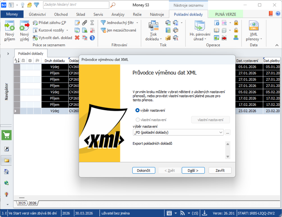 Před exportem je možné si doklady vybírat. Do XML souborů se pak exportují pouze vybrané doklady. Doporučujeme exportovat kompletní sadu dokladů s přibližně dvouletou historií, pokud je k dispozici. Příliš krátká historie neumožní identifikovat některé typy podezřelého chování. Příliš dlouhá historie není na závadu, ale zpracování v aplikaci AML Ready bude trvat delší dobu. Délka historie nemá vliv na čerpání předplacených transakcí.